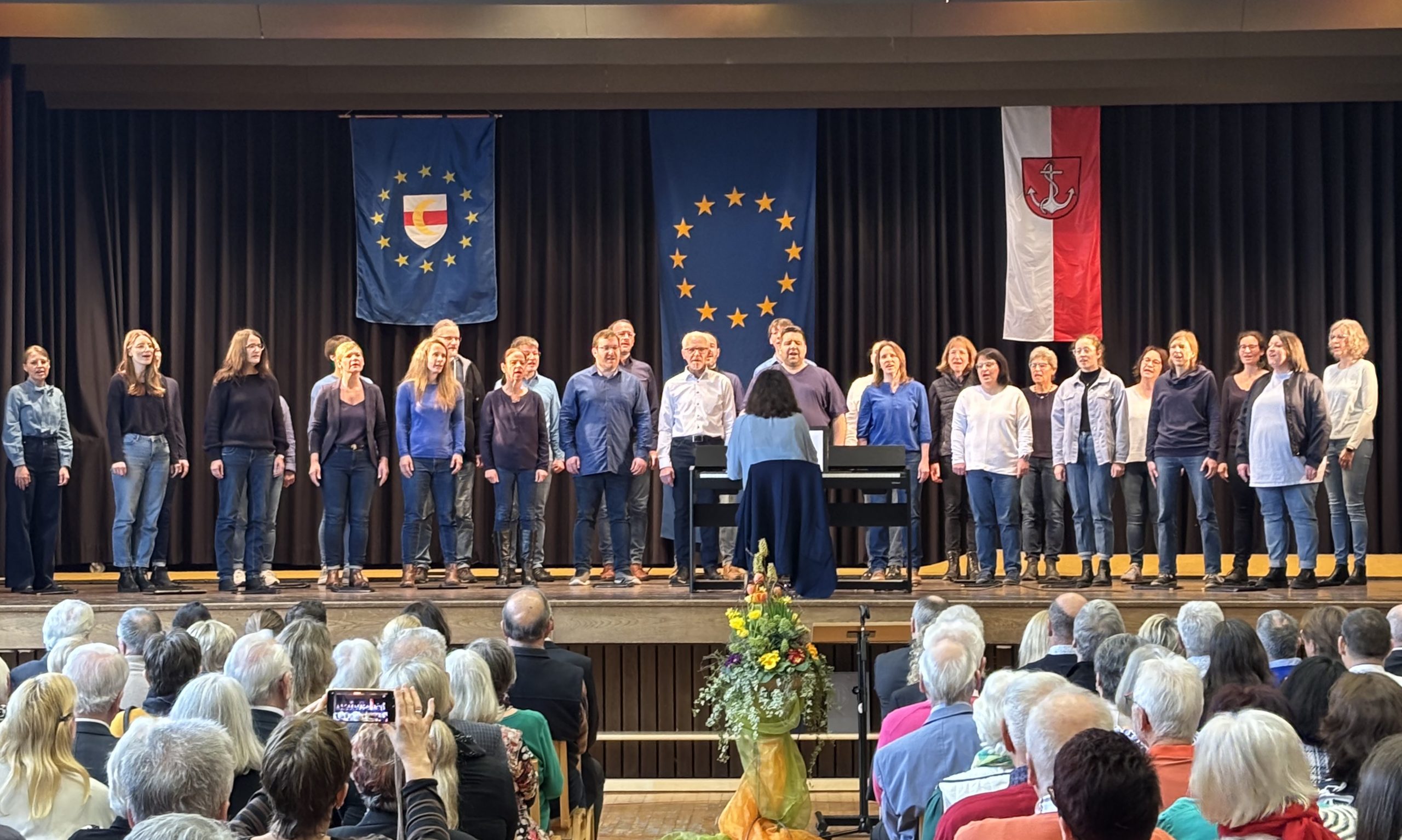 Ein tolles Gemeinschaftserlebnis liegt hinter uns. Wir durften gemeinsam mit insgesamt 159 Musikschaffenden ein grandioses Konzert in der Sporthalle im Fischerwörth bestreiten. Alle musizierenden und singenden Vereine sorgten mit 2 Stunden Programm für ein grandioses musikalisches Erlebnis. Für uns das erste Konzert nach der Corona-Zäsur. Umso schöner war es, mit ‚Applaus, Applaus‘ der Sportfreunde Stiller und ‚Tage wie diese‘ von den Toten Hosen unsere Akzente zu setzen.